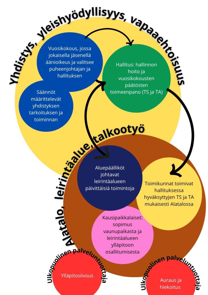 Kun asioita tarkastellaan yhdistyksen näkökulmasta, on tehtävien jako ja hoitaminen kohtalaisen selvää. Omat haasteensa hallinnon järjestämiselle tuottaa ympärivuoden toiminnassa oleva leirintäalue. Leirintäalueen päivittäisten asioiden hoitaminen ei kuulu puheenjohtajan tehtäviin. Hänen tehtäviinsä kuuluu hallinnon järjestäminen siten, että käytännön asiat tulevat hoidetuksi yhdistyksen kokouksessa asetettujen tavoitteiden ja toimintasuunnitelmien mukaisesti.